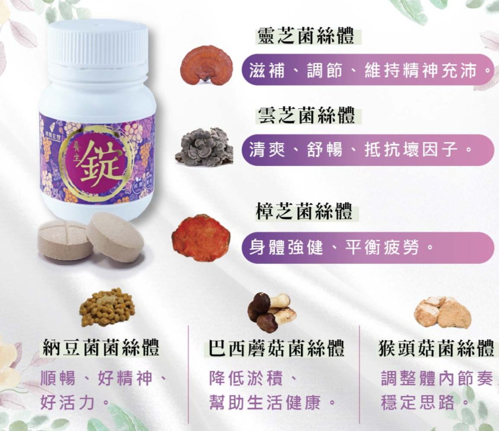 唯一由國科會核准在台南科學園區生產之產品,由有益菇蕈類:巴西蘑菇,裂褶菌,樟芝,繡球菌,納豆菌…等菌絲,萃取生產。